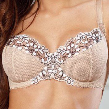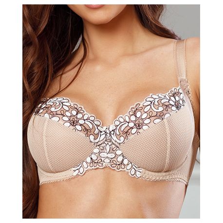 Crafted from delicate beige mesh, it exudes an air of elegance, while the exquisite black and white floral embroidery adds a touch of enchantment. The intricate floral details create a mesmerizing contrast against the neutral backdrop, ensuring that this bra stands out with its unique charm.
