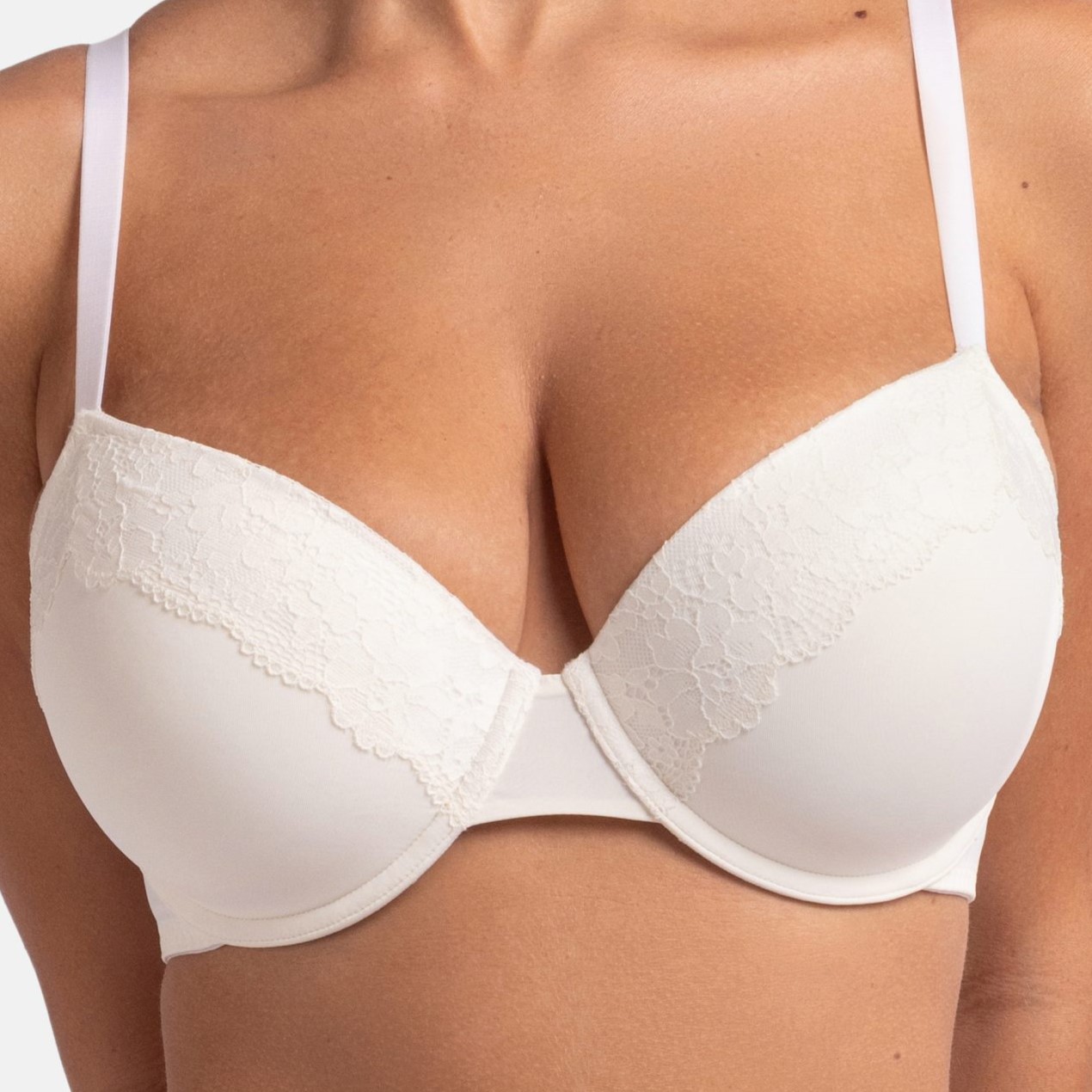 Set of 2 bras Ivory and grey. Lightly padded demi cup. Has a set of matching briefs